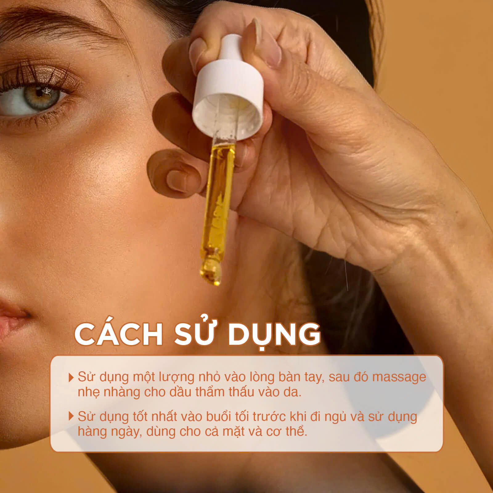 - Dưỡng da mặt: Lấy một vài giọt dầu và thoa đều lên da mặt sau khi đã làm sạch và sử dụng toner (nếu có). Massage nhẹ nhàng để dầu thẩm thấu nhanh vào da. Sử dụng vào buổi tối hoặc sáng để có làn da mềm mại và khỏe mạnh.