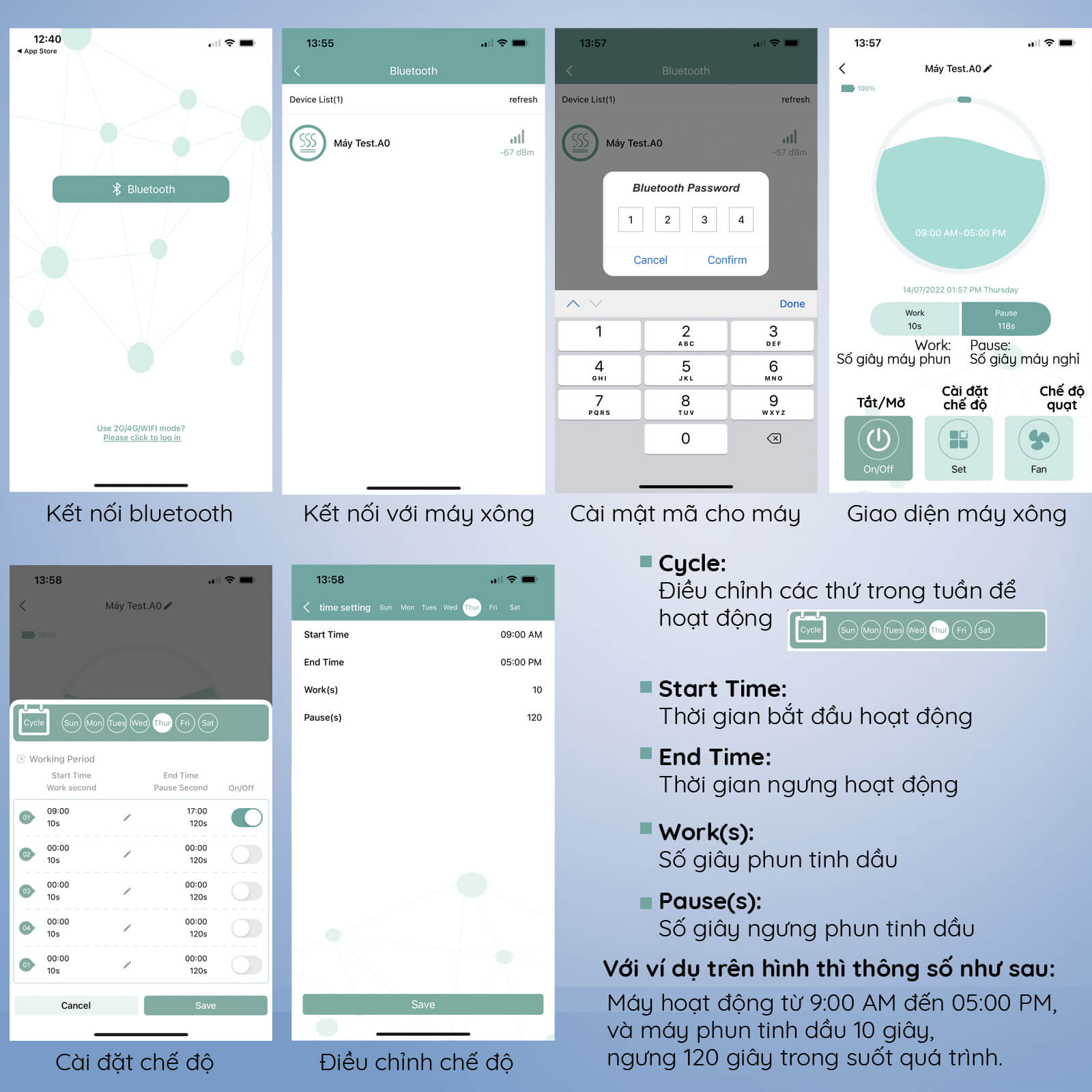 - Pause(s): Số giây ngưng phun tinh dầu.