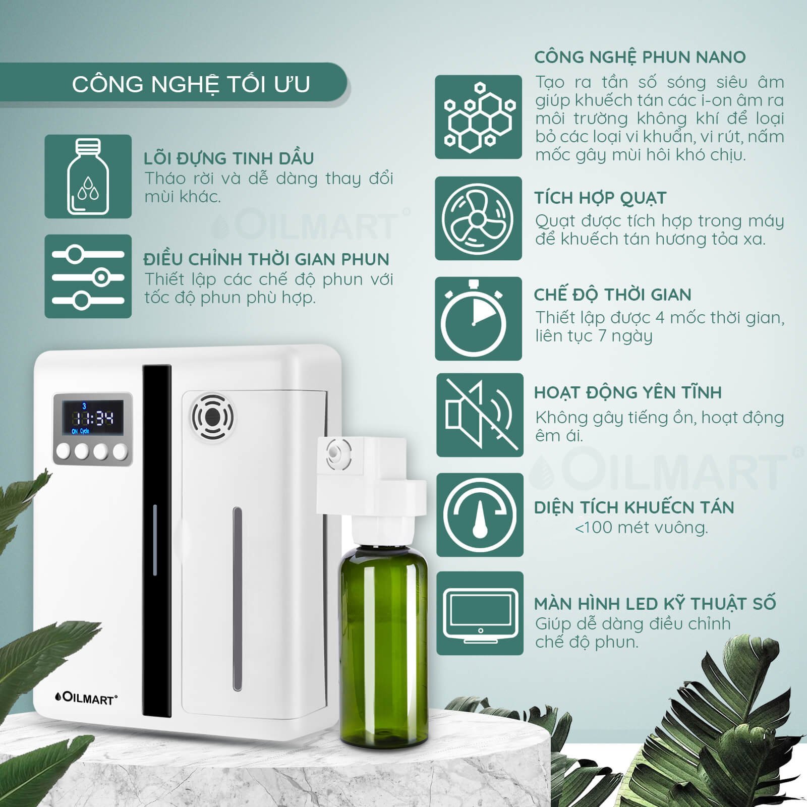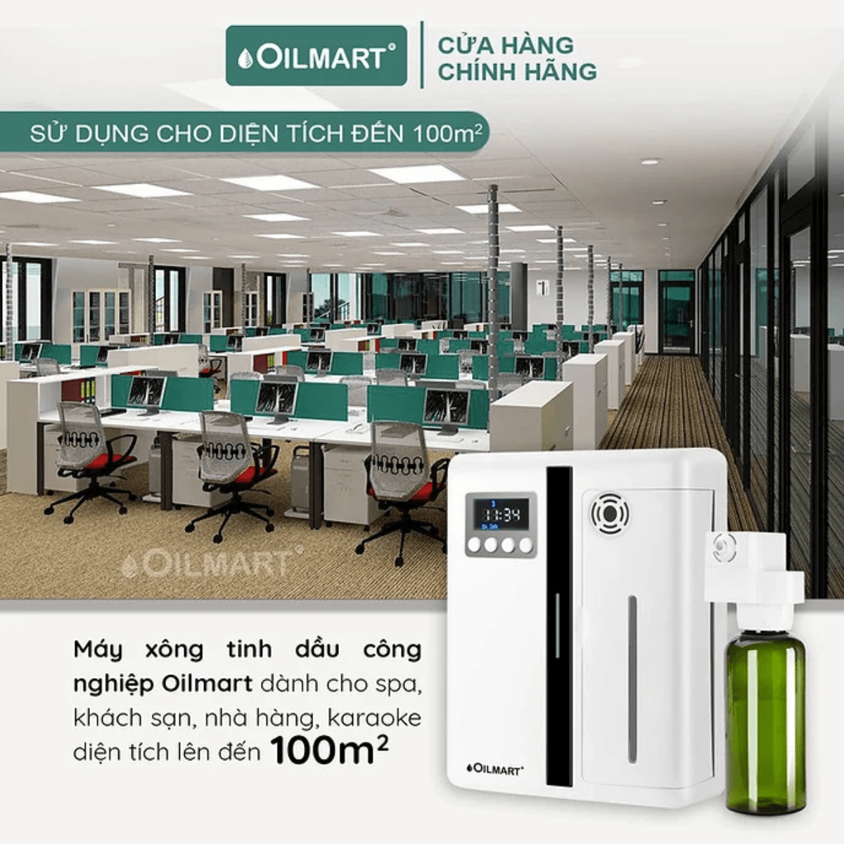 Máy xông tinh dầu công nghiệp Oilmart là giải pháp khuếch tán hương thơm hiệu quả cho không gian lớn, chuyên dụng cho các khu vực như spa, khách sạn, nhà hàng, karaoke và cửa hàng. Với công suất mạnh mẽ, thiết kế hiện đại và công nghệ tiên tiến, sản phẩm giúp mang lại không gian thơm mát, sang trọng và đẳng cấp, đồng thời tối ưu chi phí sử dụng tinh dầu.