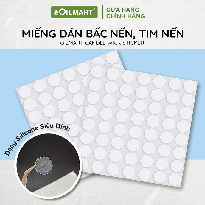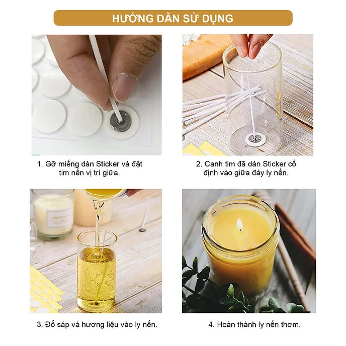 - Chỉ đơn giản là bạn bóc một miếng dán ra, dính vào vị trí mong muốn ở đáy ly. Tiếp theo, dán đế bấc/tim lên chính miếng dán. Trước khi đổ sáp thì nhớ kẹp cố định dây bấc phía trên ly nến.