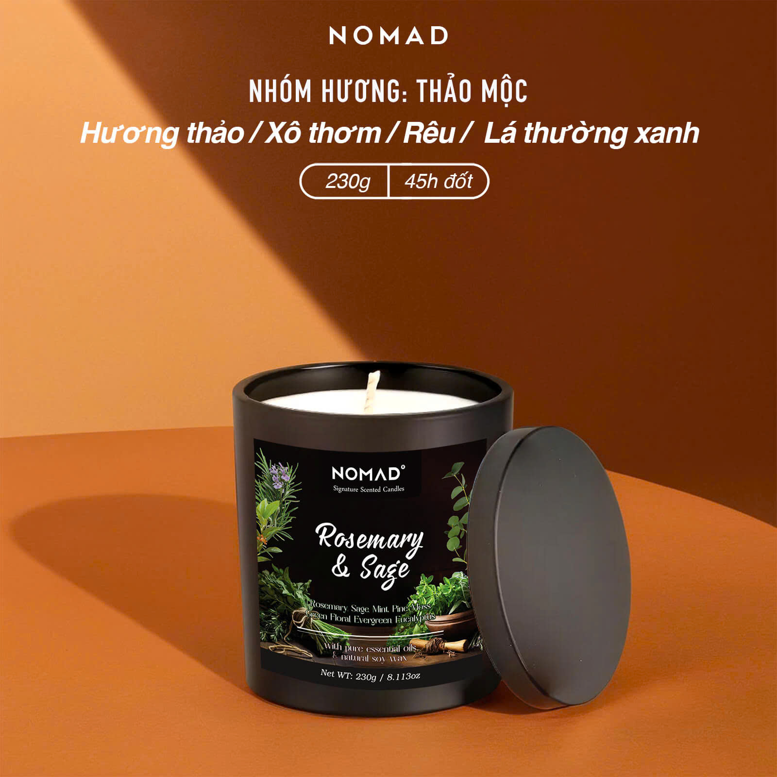 Nến Thơm Nomad Signature Scented Candle 230g - Rosemary & Sage mang đến một mùi hương tươi mới, thanh khiết và dễ chịu từ hương hương thảo mộc của rosemary (hương thảo) và sage (xô thơm). Sự kết hợp này tạo nên một không gian thư giãn, làm sạch không khí và giúp tinh thần thoải mái, sảng khoái.