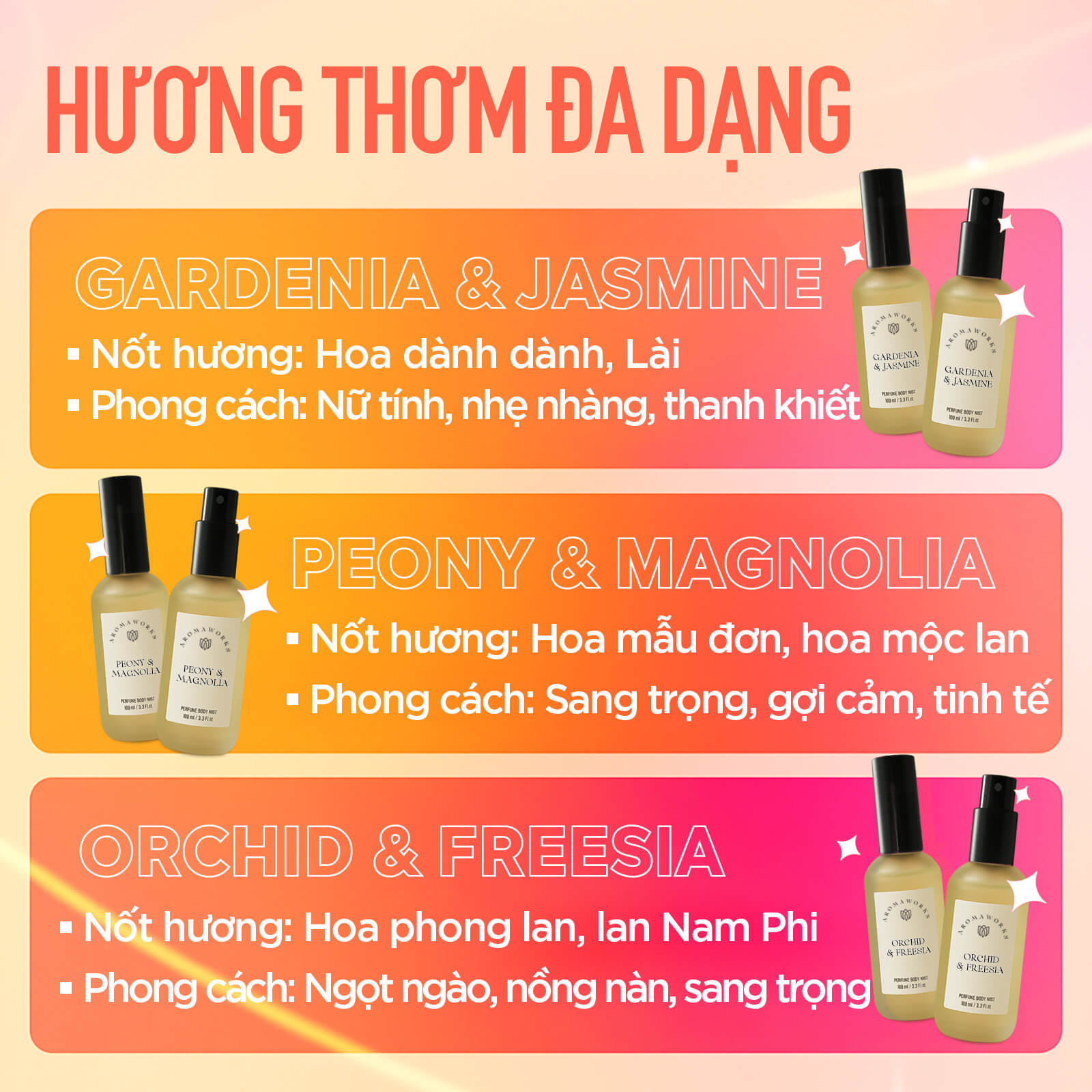 Hãy để Aroma Works Perfumed Body Mist 100ml trở thành bí quyết giúp bạn luôn tự tin, nổi bật với hương thơm cuốn hút và làn da mềm mại mỗi ngày!