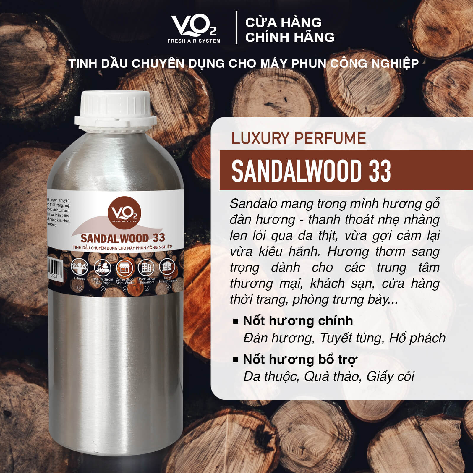 Tinh dầu VO2 Luxury Perfume - Sandalwood 33 mang hương thơm quyến rũ, sâu lắng của gỗ đàn hương kết hợp với những nốt hương nhẹ nhàng, ấm áp, tạo nên một không gian đầy thư thái và sang trọng. Đây là lựa chọn lý tưởng cho các không gian đẳng cấp như khách sạn, spa, resort, hoặc văn phòng cao cấp.
