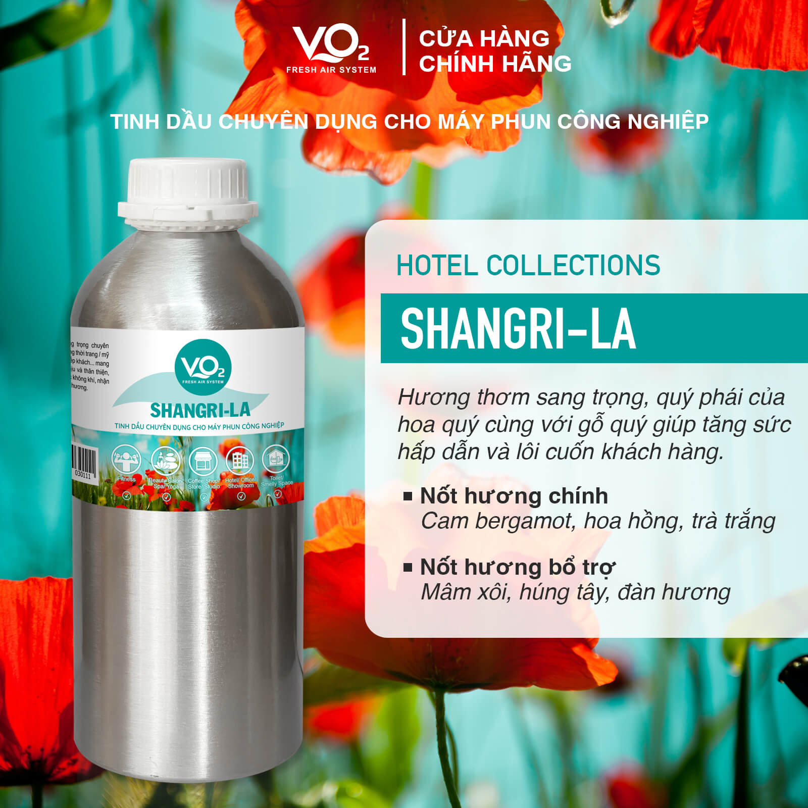 Tinh dầu VO2 Hotel Collection - Shangri-la được thiết kế để tái hiện hương thơm thanh lịch và đẳng cấp, đặc trưng của không gian khách sạn 5 sao. Đây là sự kết hợp hoàn hảo giữa các nốt hương tinh tế, giúp mang lại không gian thư giãn và sang trọng, phù hợp cho khách sạn, spa, resort hoặc văn phòng cao cấp.