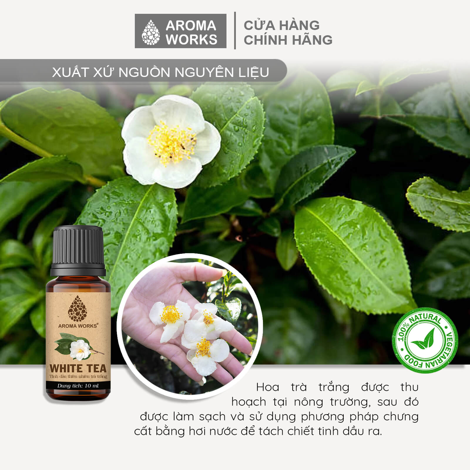 - Tinh dầu thiên nhiên nguyên chất: Được chiết xuất từ trà trắng tự nhiên, đảm bảo tinh khiết và an toàn khi sử dụng.