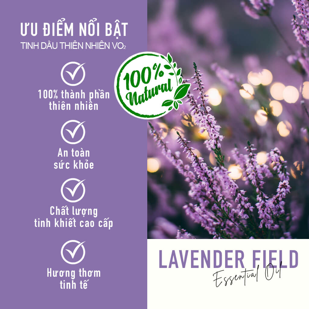VO2 Pure Collection - Lavender Field là dòng tinh dầu thiên nhiên cao cấp, được chiết xuất từ hoa oải hương (Lavandula angustifolia) nguyên chất. Sản phẩm mang đến hương thơm dịu nhẹ, thư thái, giúp thư giãn tinh thần, tạo không gian sống cân bằng và trong lành. Đặc biệt phù hợp với máy phun tinh dầu công nghiệp, đáp ứng nhu cầu sử dụng cho không gian lớn như spa, khách sạn, nhà hàng hay gia đình.