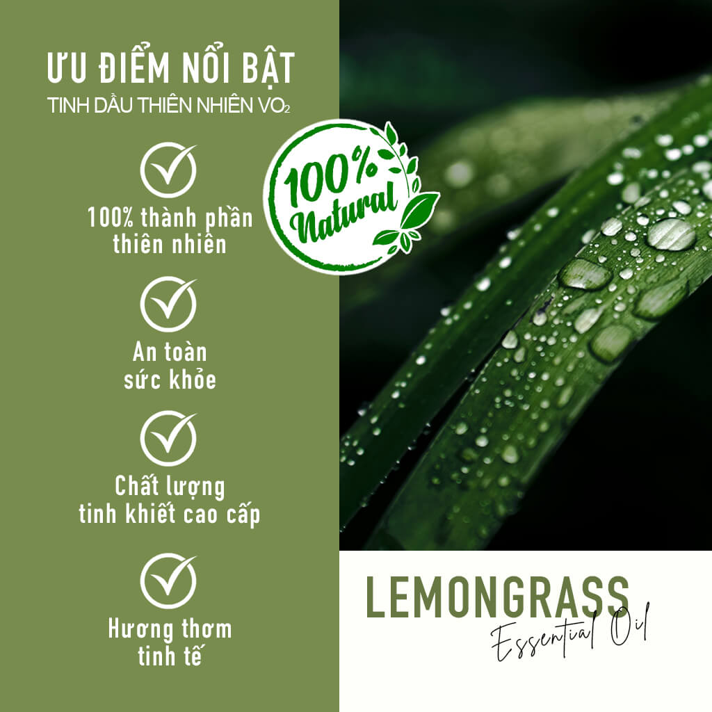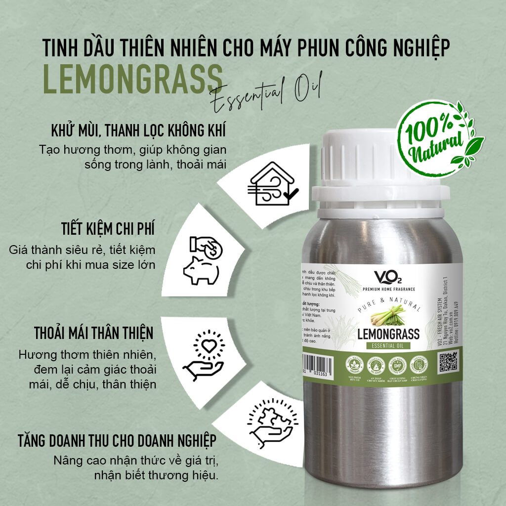 VO2 Pure Collection - Lemongrass là dòng tinh dầu thiên nhiên cao cấp, được chiết xuất từ cây sả chanh nguyên chất, nổi bật với hương thơm sảng khoái và công dụng khử mùi, thanh lọc không khí hiệu quả. Với độ đậm đặc tối ưu, sản phẩm được thiết kế dành riêng cho các máy phun tinh dầu công nghiệp, phù hợp với nhiều không gian lớn như khách sạn, spa, nhà hàng hoặc gia đình.