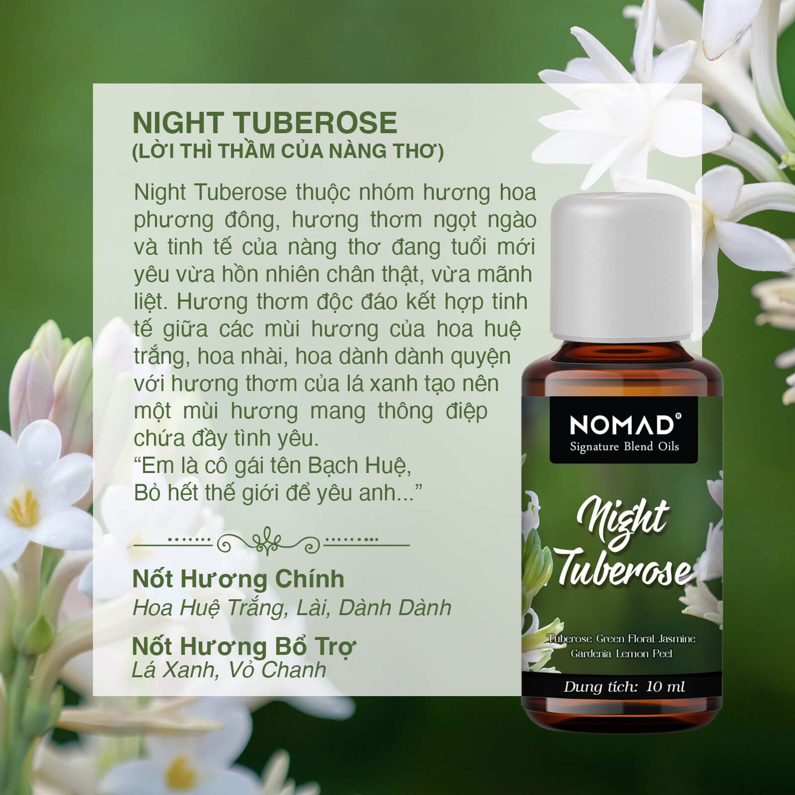 Night Tuberose thuộc nhóm hương hoa phương đông, hương thơm ngọt ngào và tinh tế của nàng thơ đang tuổi mới yêu vừa hồn nhiên chân thật, vừa mãnh liệt. Hương thơm độc đáo kết hợp tinh tế giữa các mùi hương của hoa huệ trắng, hoa nhài, hoa dành dành quyện với hương thơm của lá xanh tạo nên một mùi hương mang thông điệp chứa đầy tình yêu.