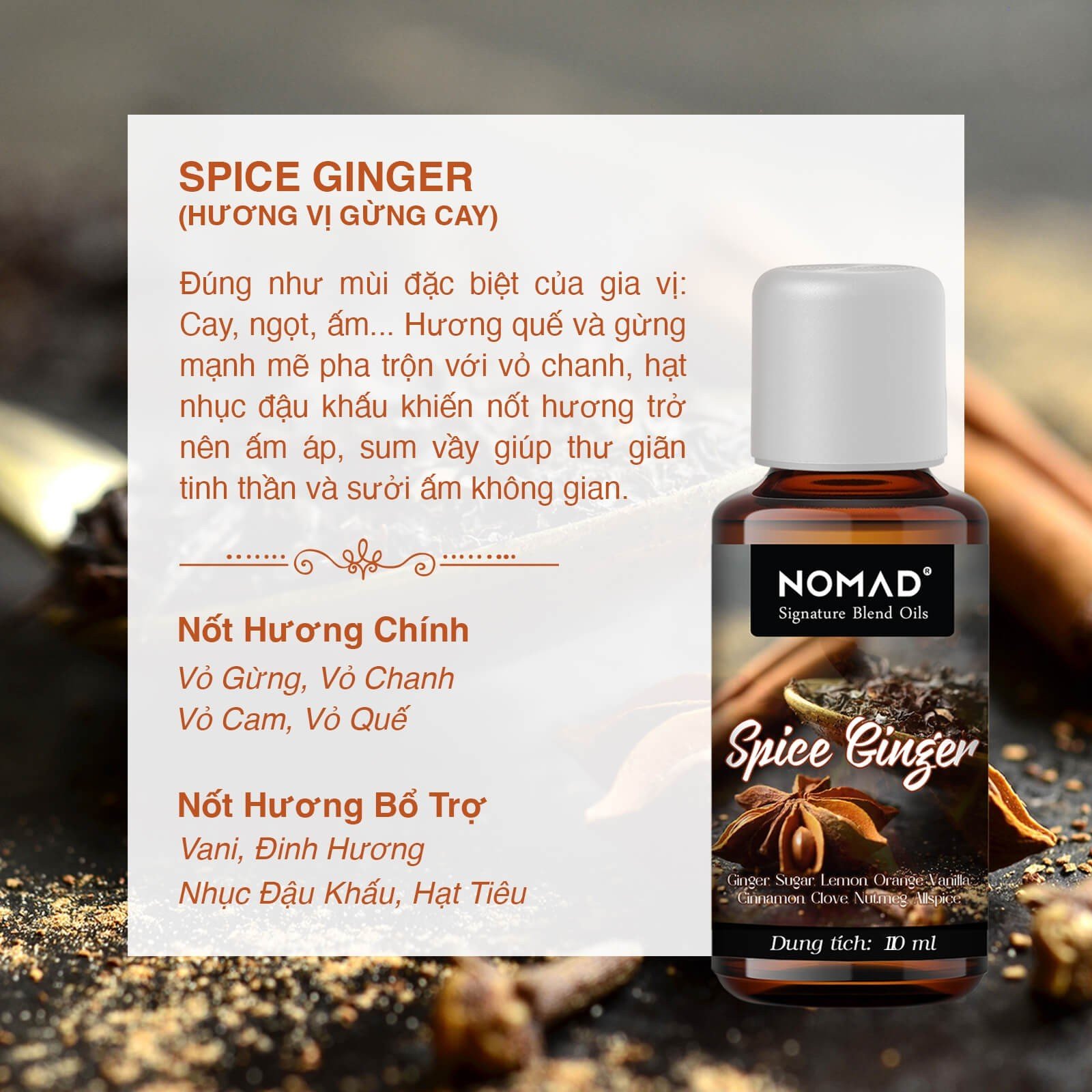 Tinh Dầu Nomad Signature Blend Oils - Spice Ginger là sự kết hợp tinh tế giữa hương gừng cay nồng và các nốt gia vị ấm áp, tạo nên một mùi hương mạnh mẽ, đầy năng lượng và lôi cuốn. Với sự kết hợp giữa gừng tươi và các gia vị như quế, hạt tiêu, Spice Ginger mang đến một không gian sống sôi động, ấm áp và đầy sức sống. Đây là lựa chọn lý tưởng cho những ai yêu thích sự nồng nàn, tươi mới, giúp kích thích tinh thần và tạo nên một bầu không khí tràn đầy năng lượng và sự phấn khích.